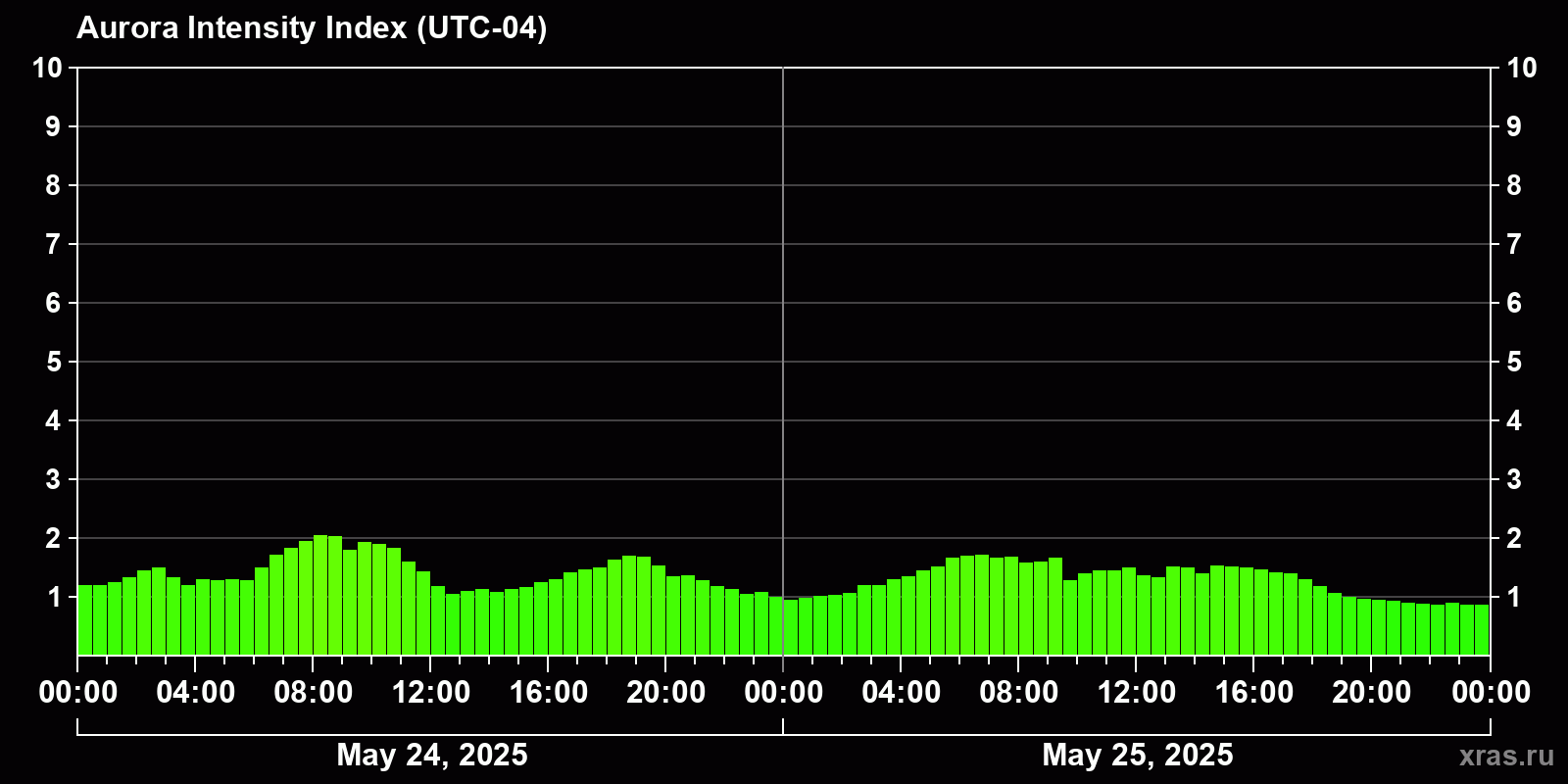 Auroral intensity index and the theoretically possible latitude of observations for nighttime in the Western Hemisphere as of 2025-05-25 23:46 (end of day) local time