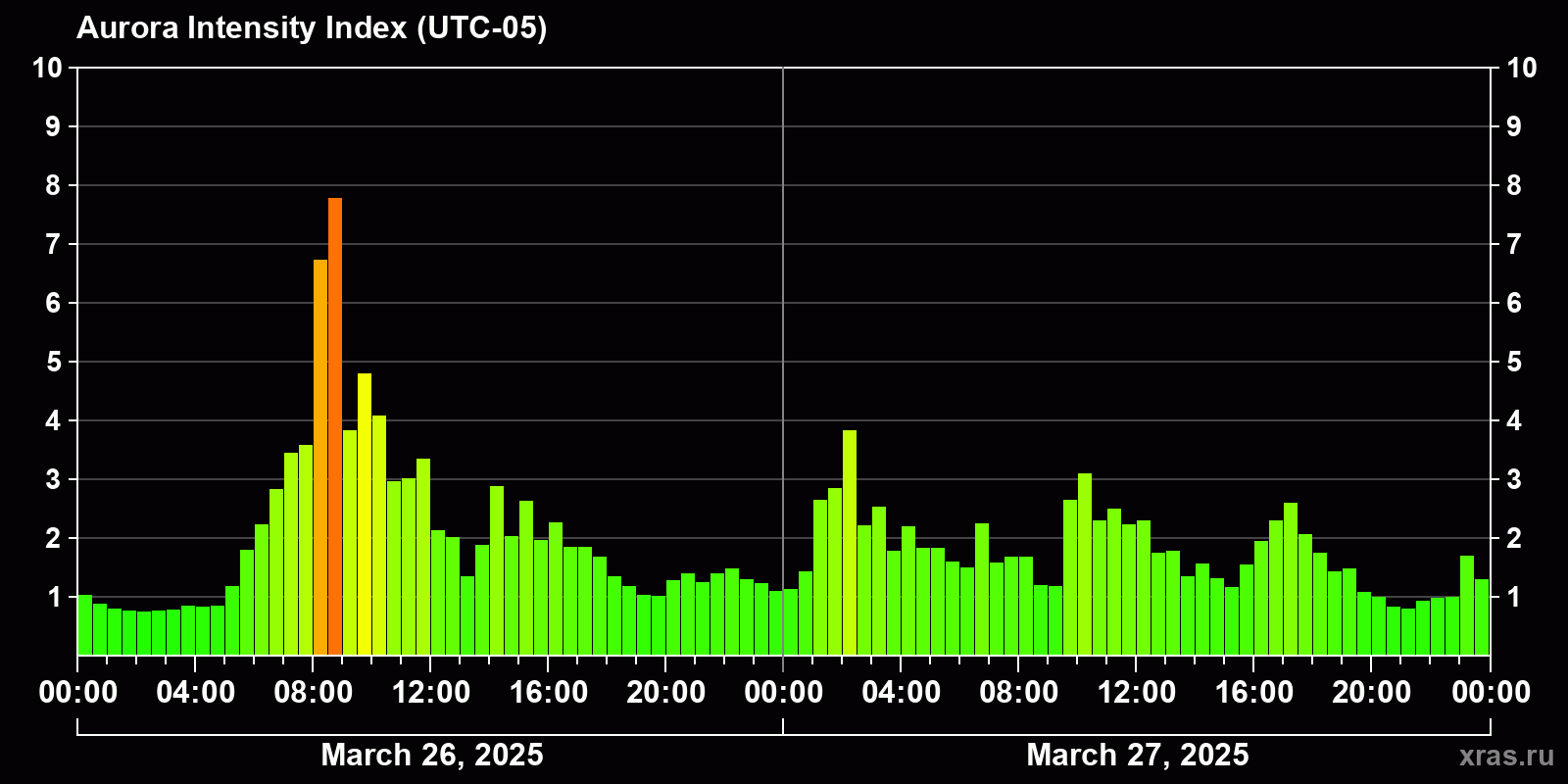 Changes in the auroral intensity index from 2025-03-26 to 2025-03-27 local time