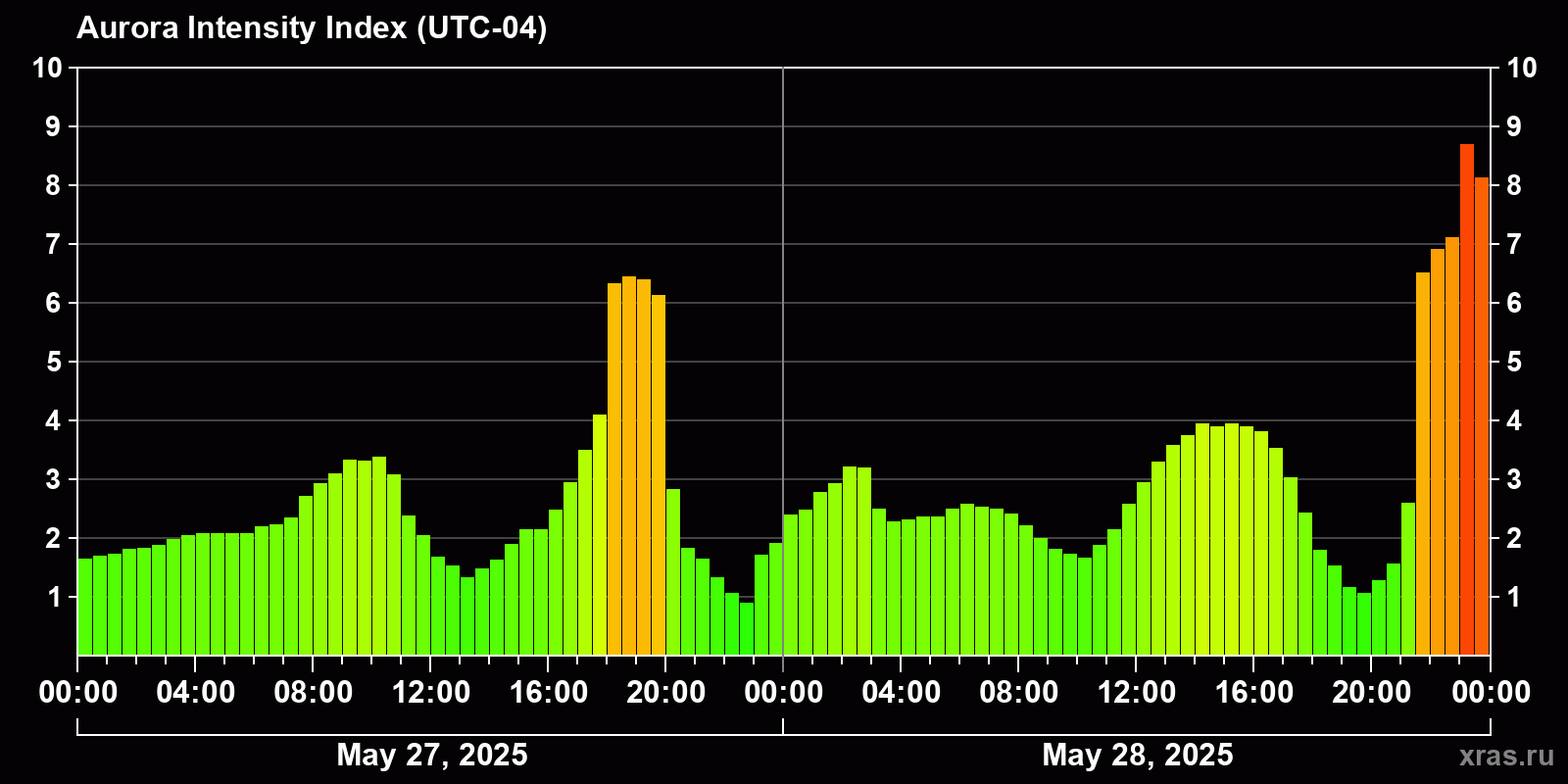 Auroral intensity index and the theoretically possible latitude of observations for nighttime in the Western Hemisphere as of 2025-05-28 23:55 (end of day) local time