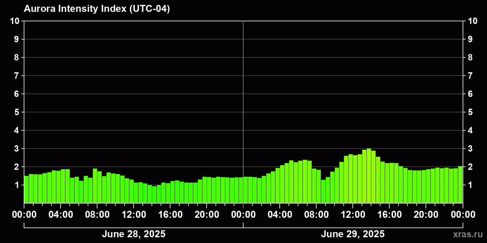 Changes in the auroral intensity index from 2025-06-28 to 2025-06-29 local time