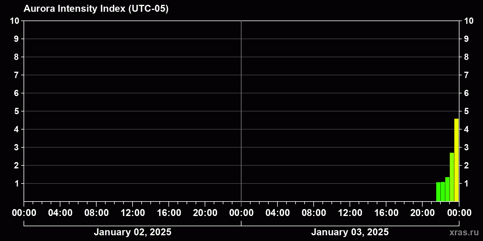 Auroral intensity index and the theoretically possible latitude of observations for nighttime in the Western Hemisphere as of 2025-01-03 23:56 (end of day) local time