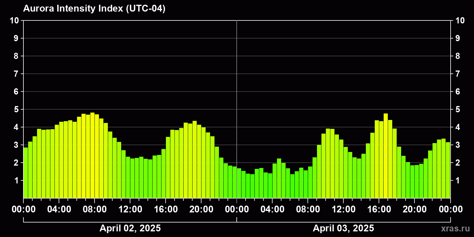 Auroral intensity index and the theoretically possible latitude of observations for nighttime in the Western Hemisphere as of 2025-04-03 23:50 (end of day) local time
