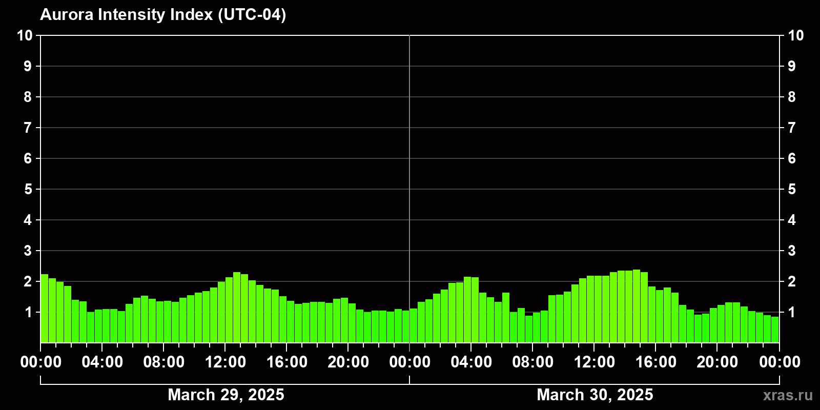 Auroral intensity index and the theoretically possible latitude of observations for nighttime in the Western Hemisphere as of 2025-03-30 23:47 (end of day) local time