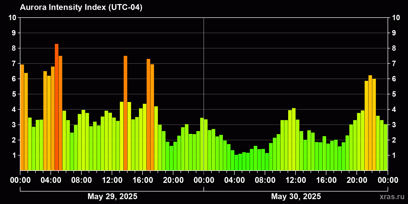 Auroral intensity index and the theoretically possible latitude of observations for nighttime in the Western Hemisphere as of 2025-05-30 23:59 (end of day) local time