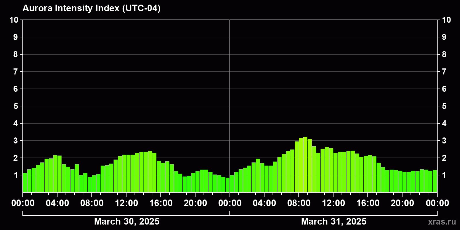 Changes in the auroral intensity index from 2025-03-30 to 2025-03-31 local time