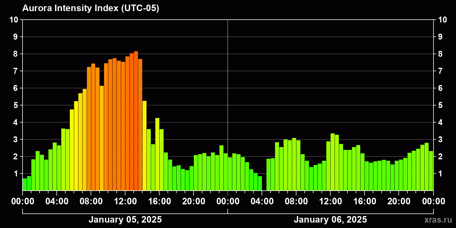 Changes in the auroral intensity index from 2025-01-05 to 2025-01-06 local time