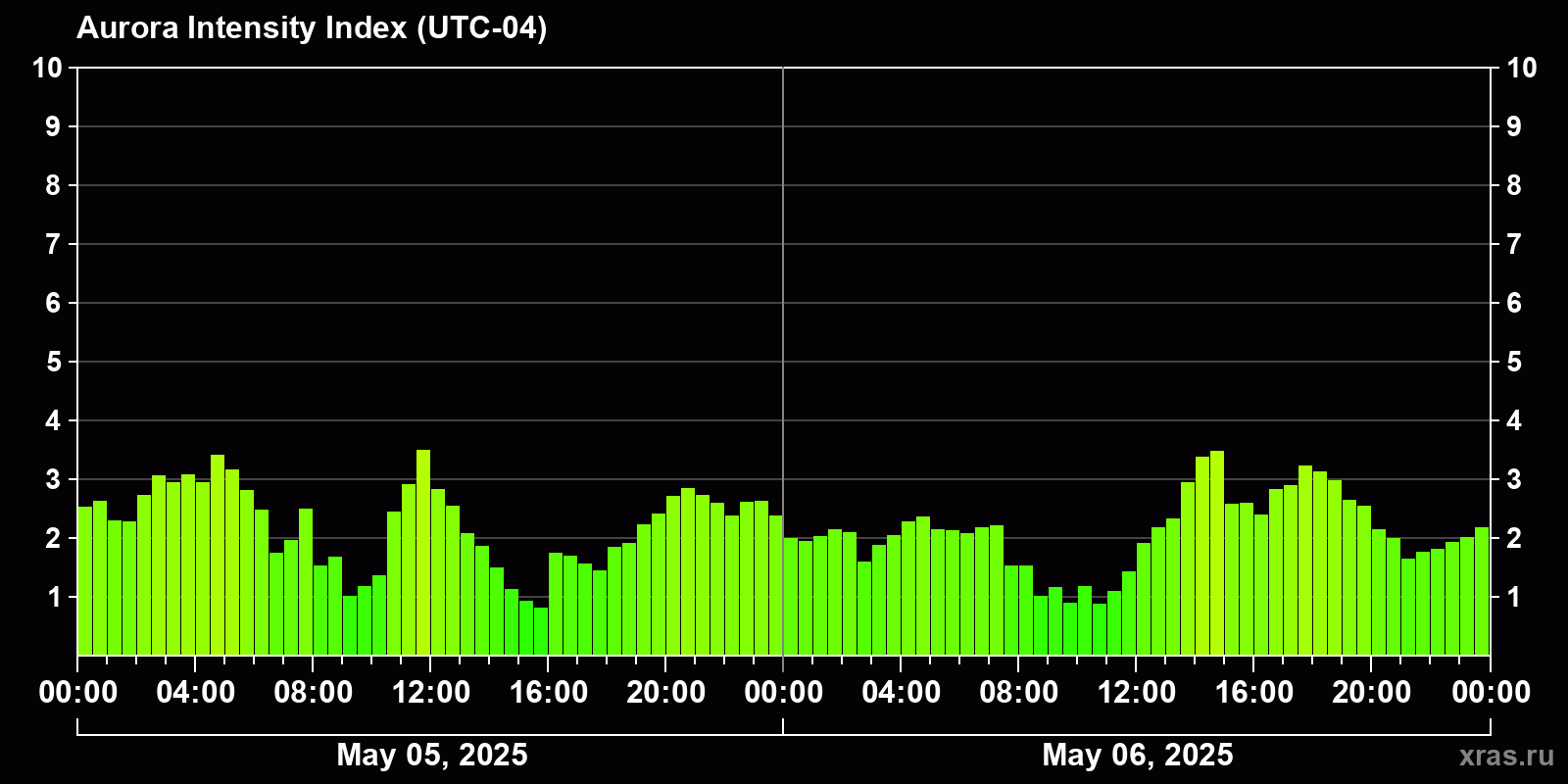 Auroral intensity index and the theoretically possible latitude of observations for nighttime in the Western Hemisphere as of 2025-05-06 23:57 (end of day) local time