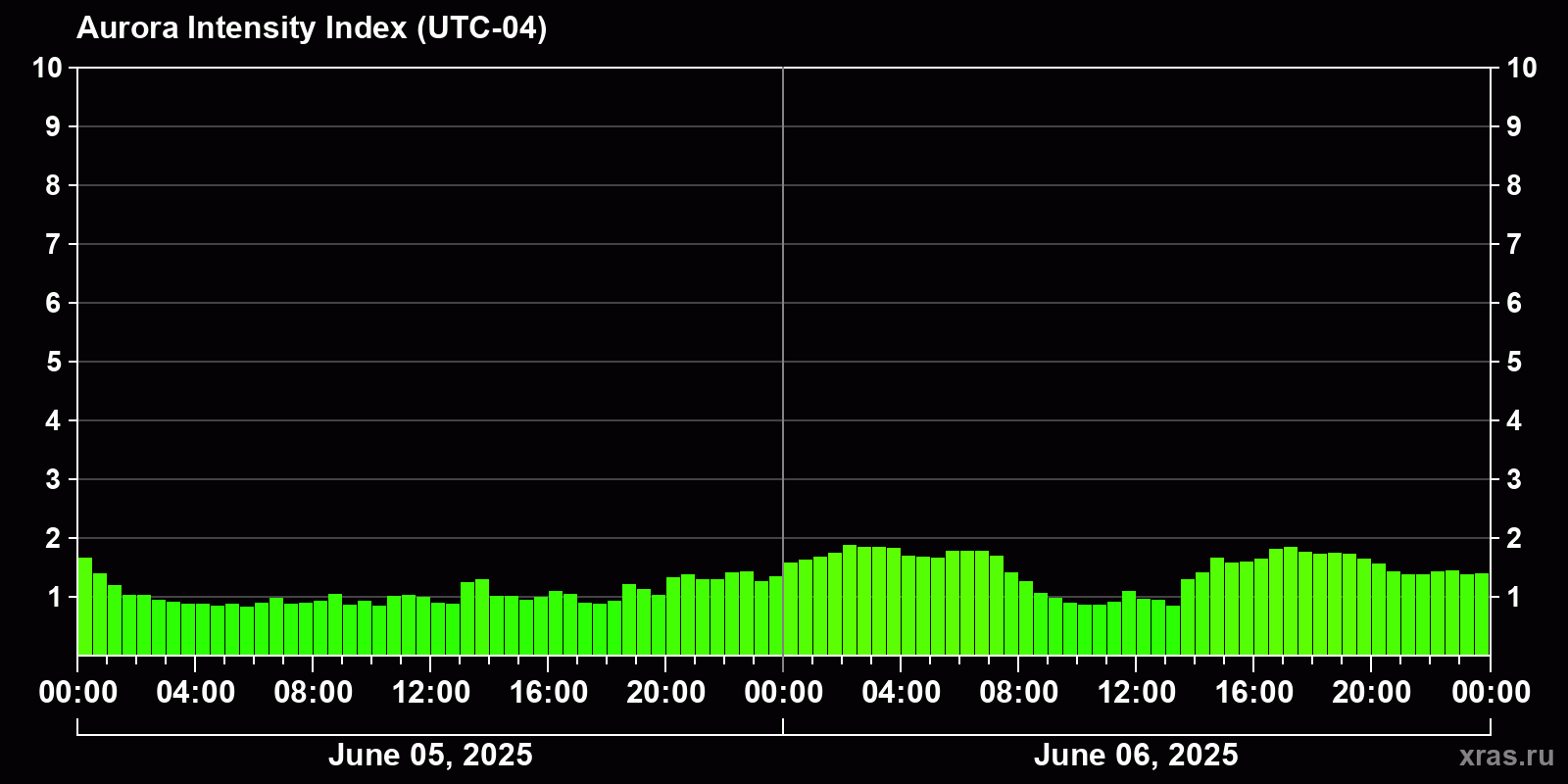 Changes in the auroral intensity index from 2025-06-05 to 2025-06-06 local time