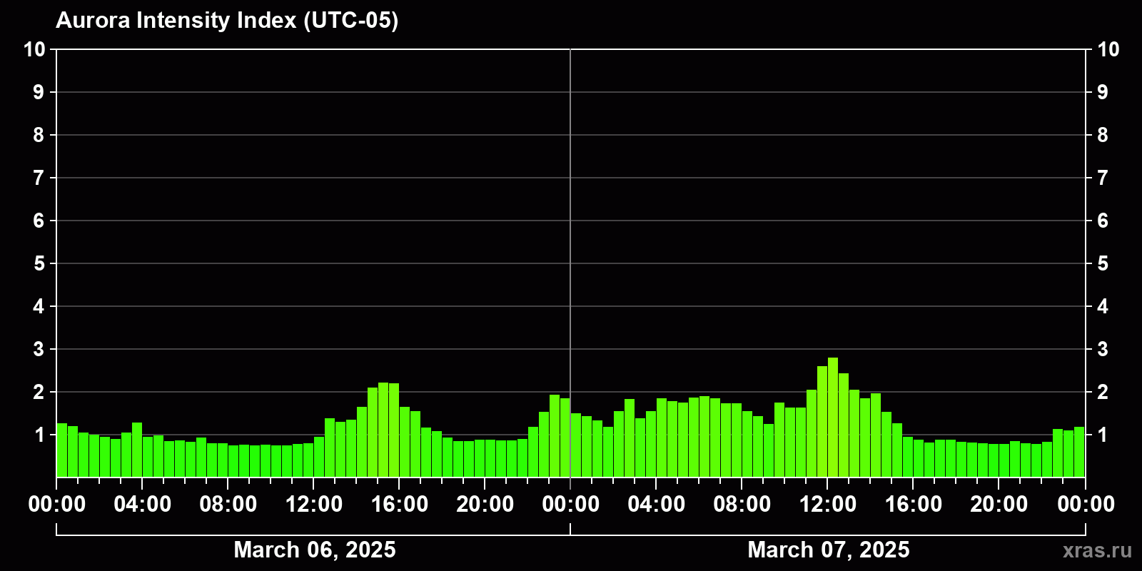 Auroral intensity index and the theoretically possible latitude of observations for nighttime in the Western Hemisphere as of 2025-03-07 23:58 (end of day) local time