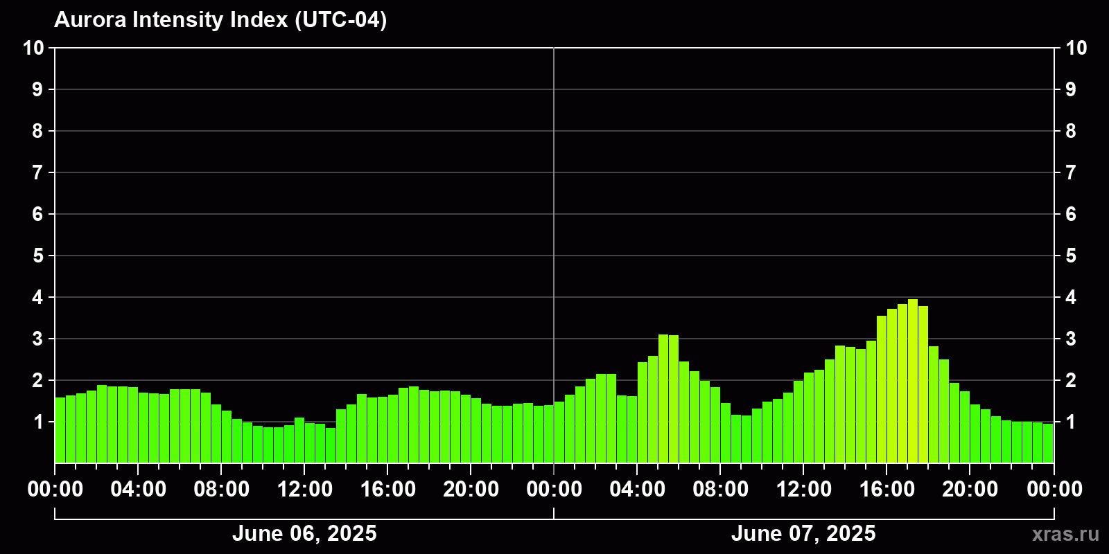 Auroral intensity index and the theoretically possible latitude of observations for nighttime in the Western Hemisphere as of 2025-06-07 23:58 (end of day) local time