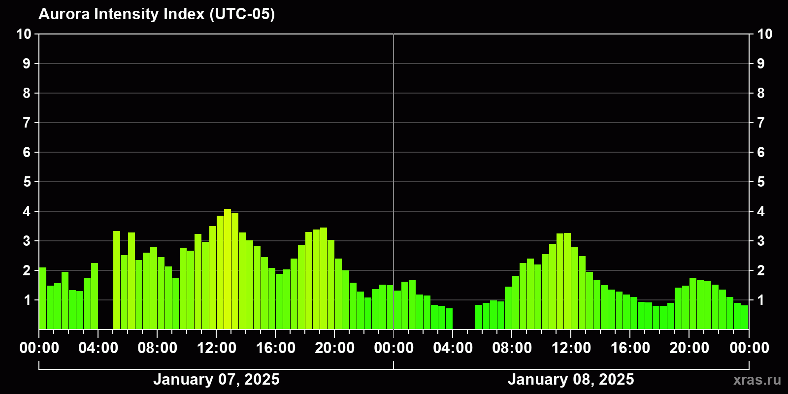 Auroral intensity index and the theoretically possible latitude of observations for nighttime in the Western Hemisphere as of 2025-01-08 23:51 (end of day) local time