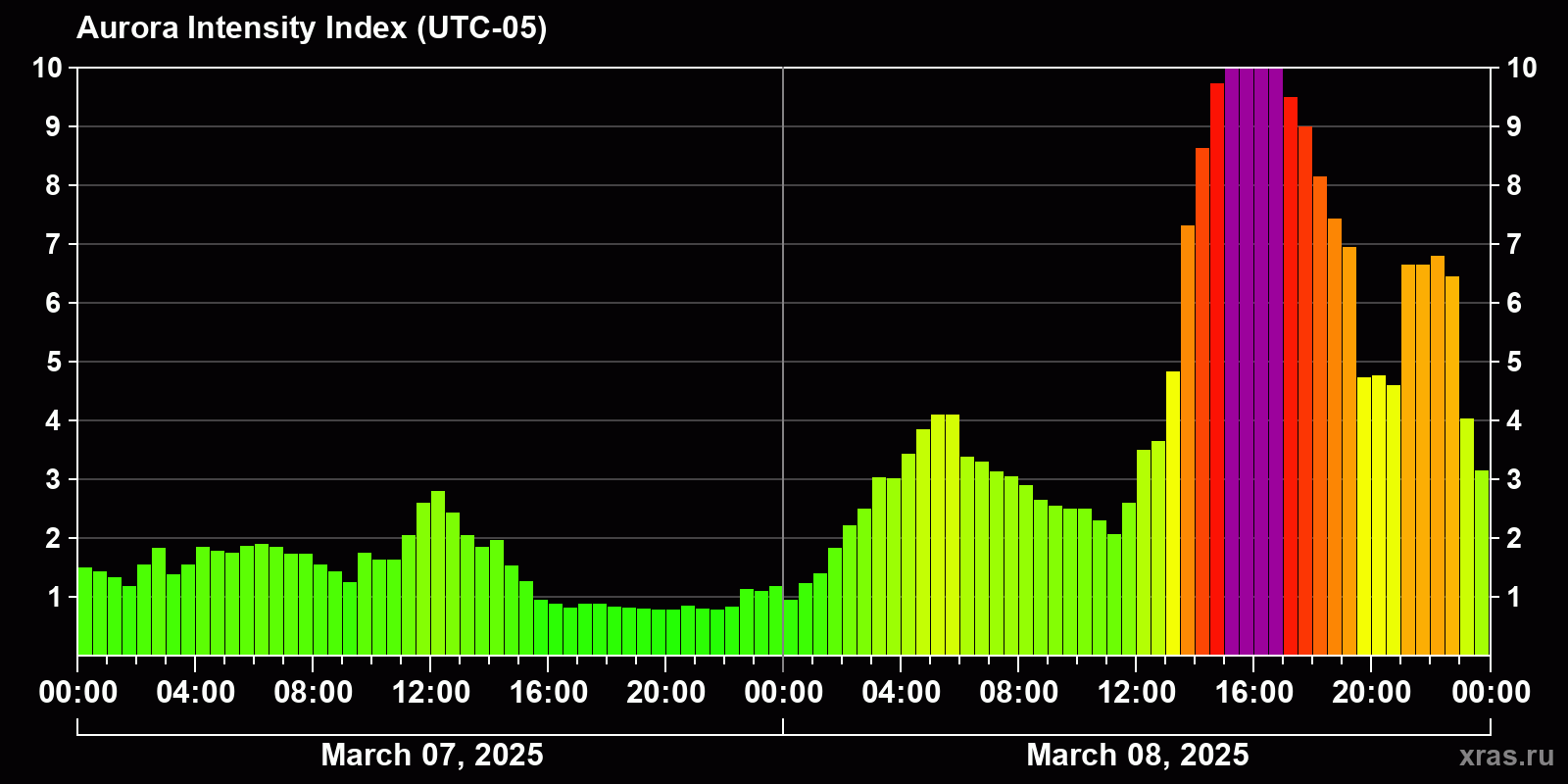 Changes in the auroral intensity index from 2025-03-07 to 2025-03-08 local time