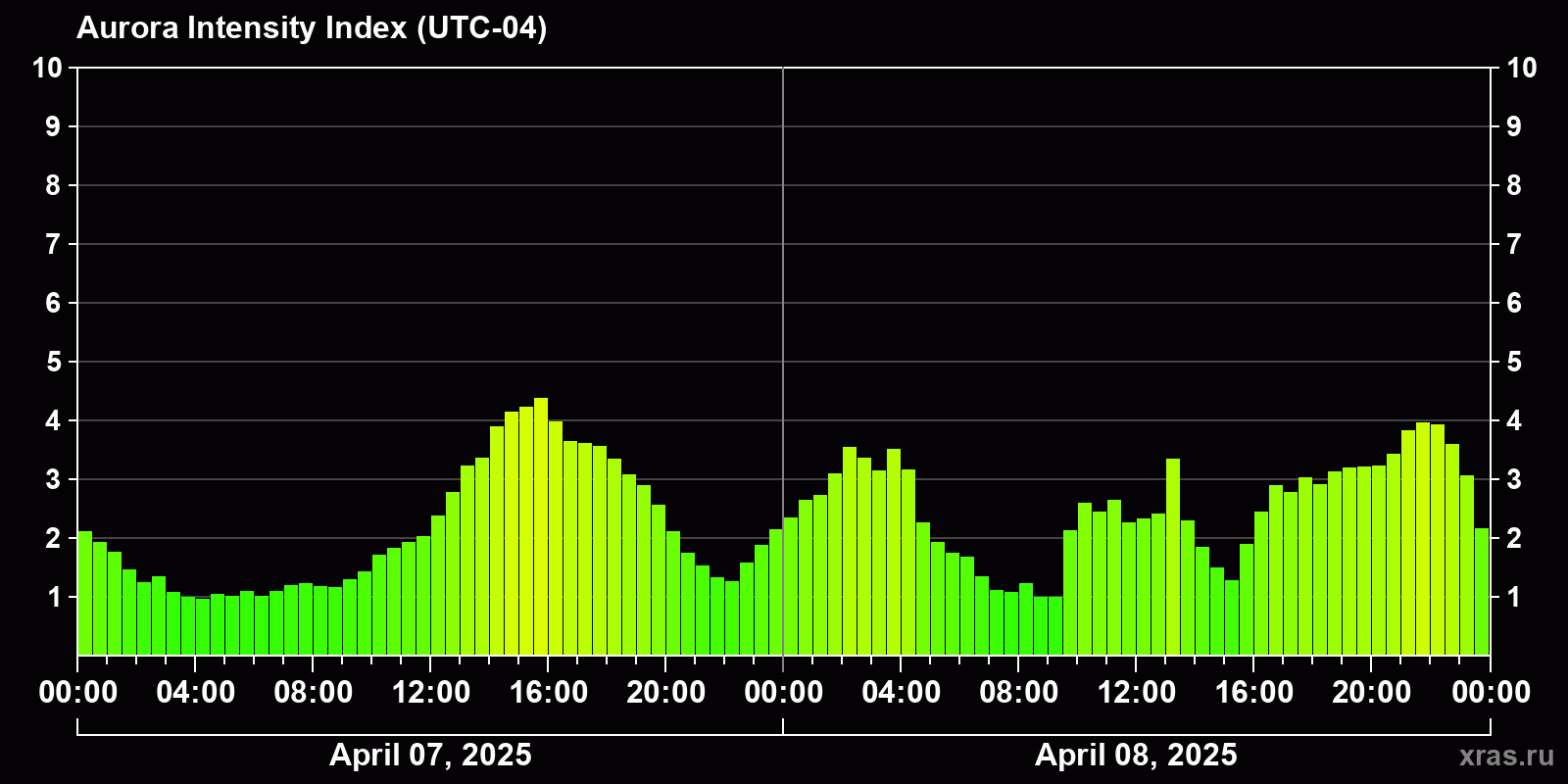 Auroral intensity index and the theoretically possible latitude of observations for nighttime in the Western Hemisphere as of 2025-04-08 23:53 (end of day) local time