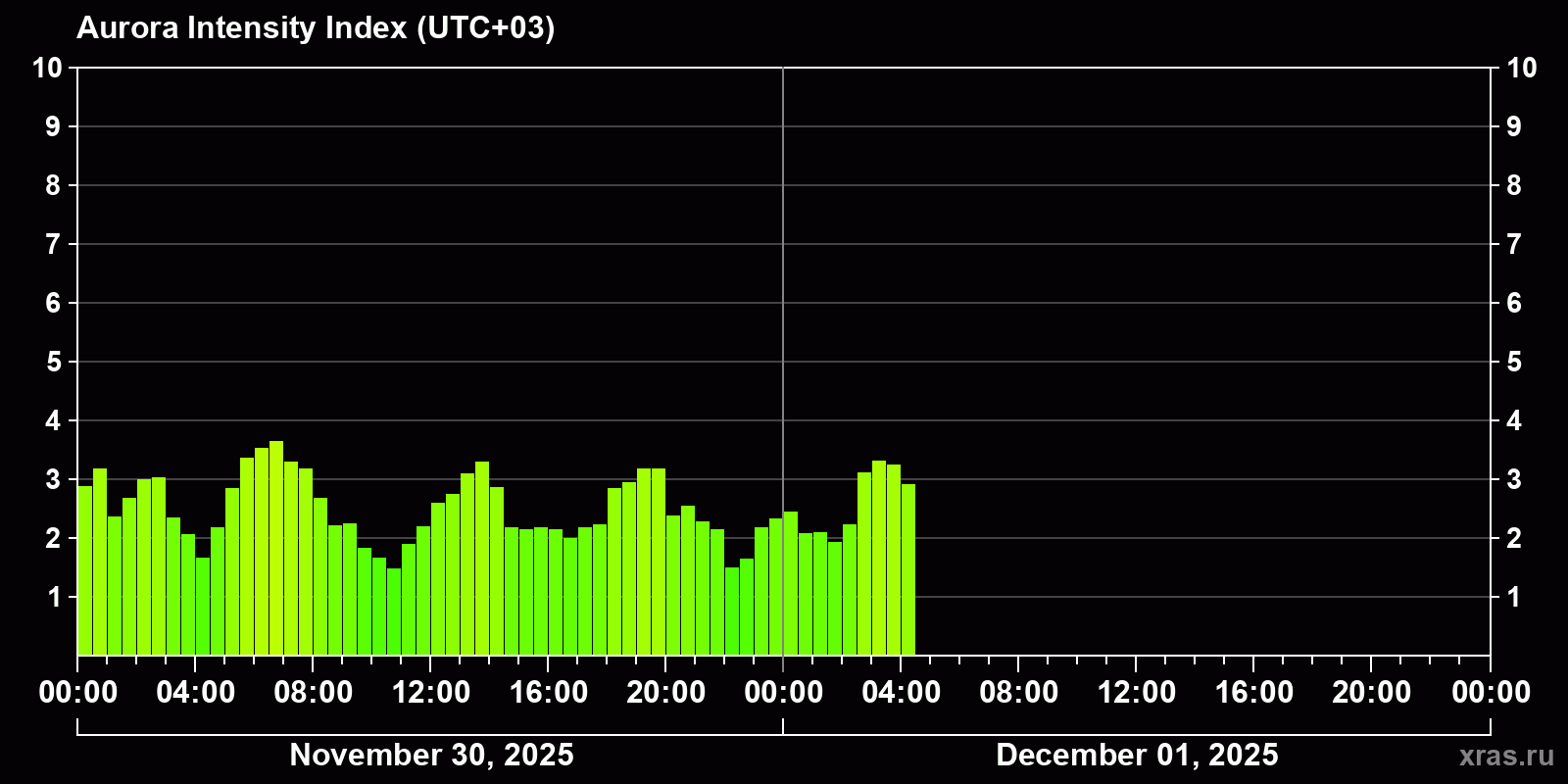 Auroral intensity index and the theoretically possible latitude of observations for nighttime in the Estern Hemisphere as of 2025-12-01 03:39 (end of day) local time