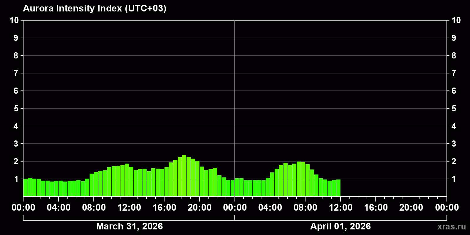 Auroral intensity index and the theoretically possible latitude of observations for nighttime in the Estern Hemisphere as of 2026-04-01 10:09 (end of day) local time