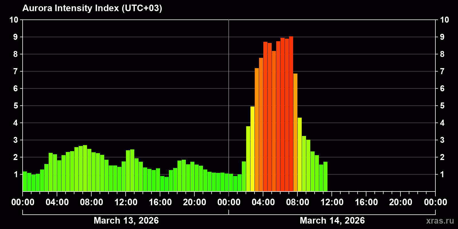 Auroral intensity index and the theoretically possible latitude of observations for nighttime in the Estern Hemisphere as of 2026-03-14 09:58 (end of day) local time
