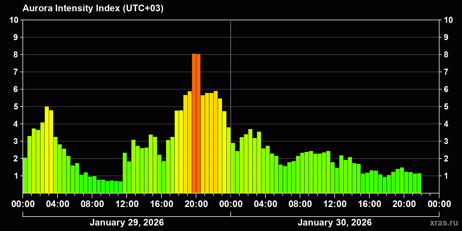 Auroral intensity index and the theoretically possible latitude of observations for nighttime in the Estern Hemisphere as of 2026-01-30 20:26 (end of day) local time