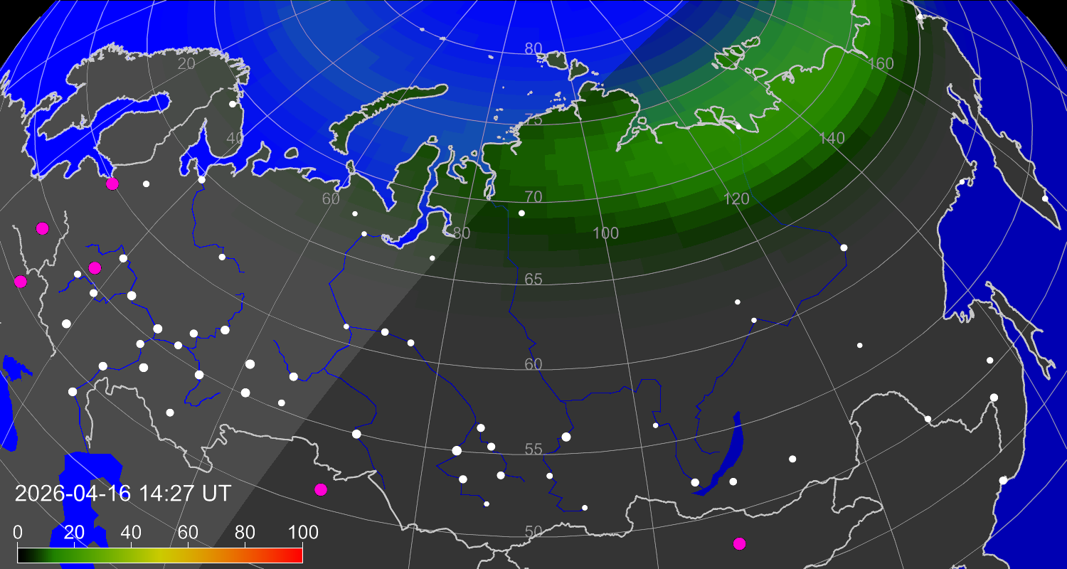 Northern lights (auroras) over the territory of Eurasia