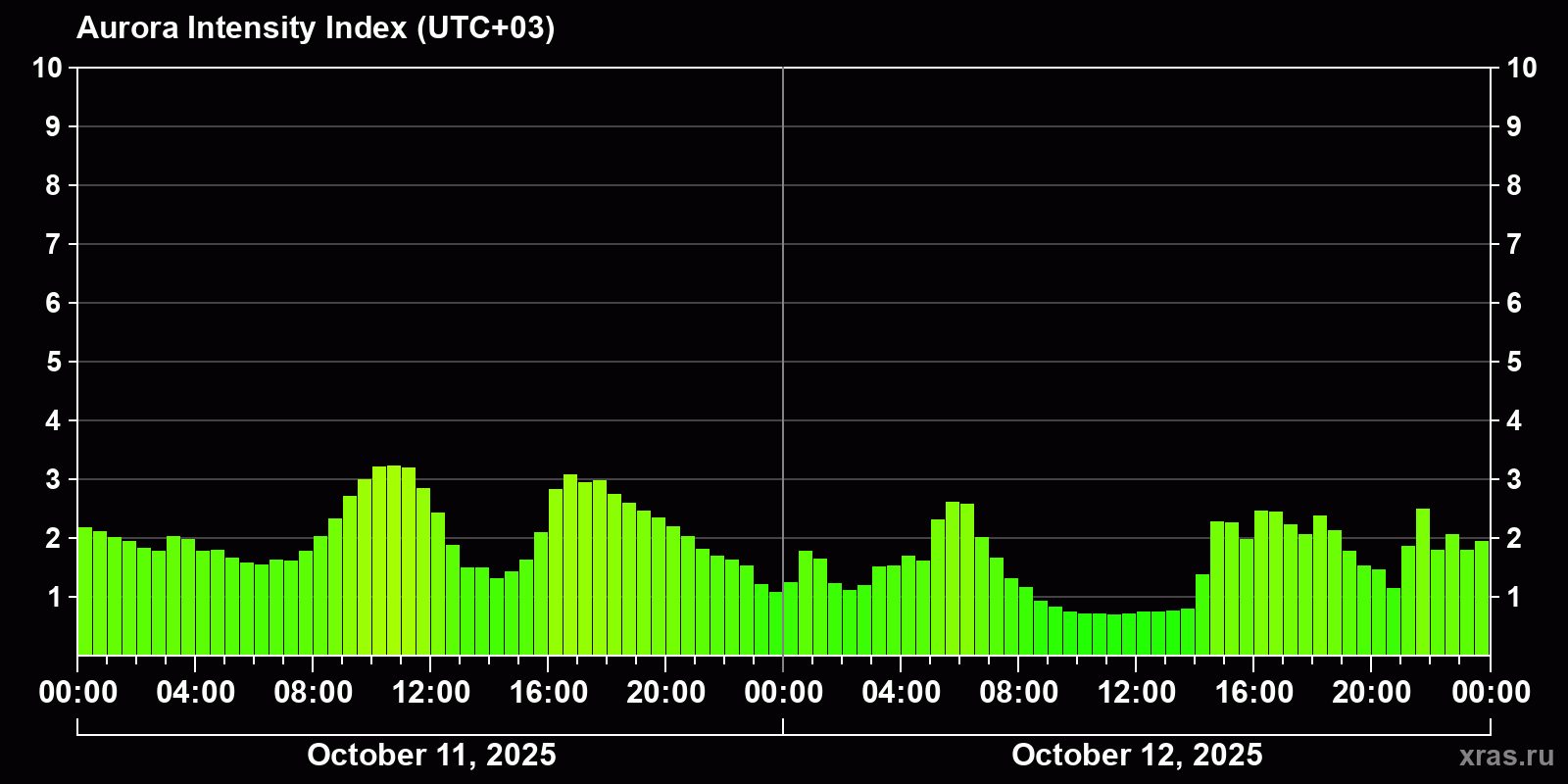 Auroral intensity index and the theoretically possible latitude of observations for nighttime in the Estern Hemisphere as of 2025-10-12 23:50 (end of day) local time