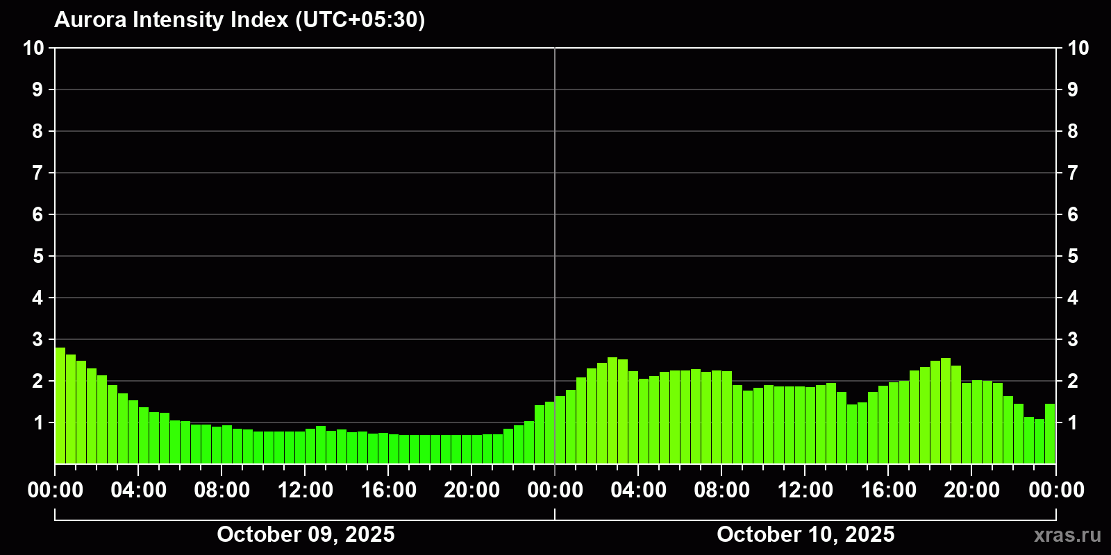 Auroral intensity index and the theoretically possible latitude of observations for nighttime in the Estern Hemisphere as of 2025-10-10 23:50 (end of day) local time