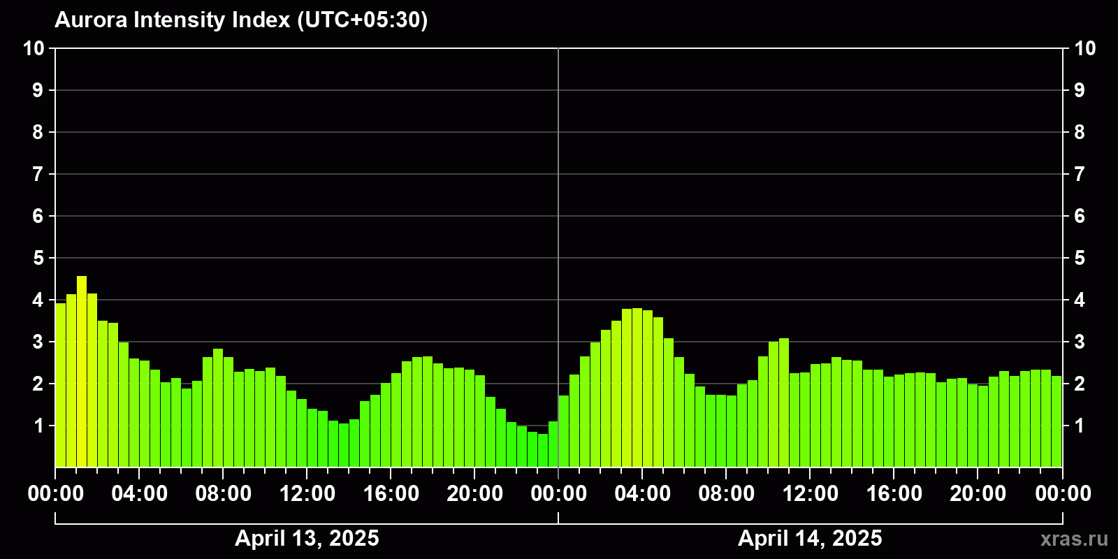 Auroral intensity index and the theoretically possible latitude of observations for nighttime in the Estern Hemisphere as of 2025-04-14 23:49 (end of day) local time