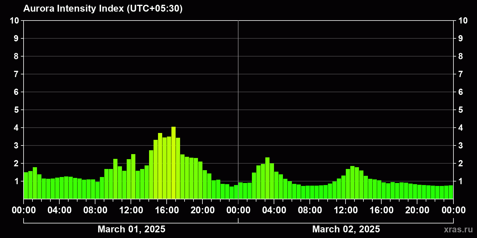 Changes in the auroral intensity index from 2025-03-01 to 2025-03-02 local time