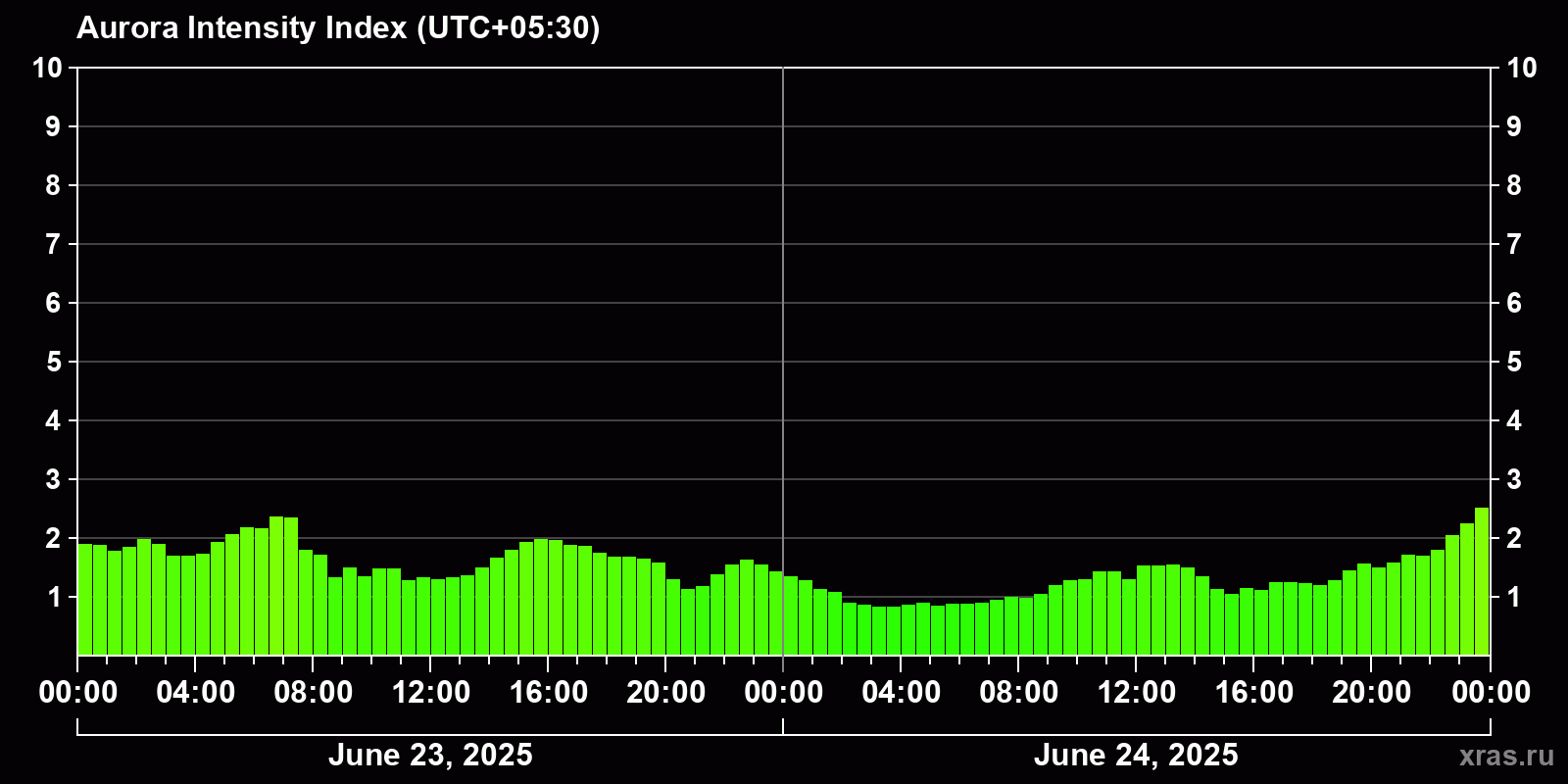 Auroral intensity index and the theoretically possible latitude of observations for nighttime in the Estern Hemisphere as of 2025-06-24 23:55 (end of day) local time