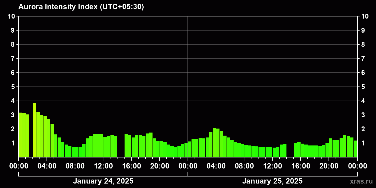 Auroral intensity index and the theoretically possible latitude of observations for nighttime in the Estern Hemisphere as of 2025-01-25 23:50 (end of day) local time
