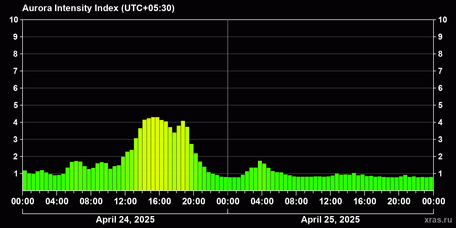 Auroral intensity index and the theoretically possible latitude of observations for nighttime in the Estern Hemisphere as of 2025-04-25 23:57 (end of day) local time
