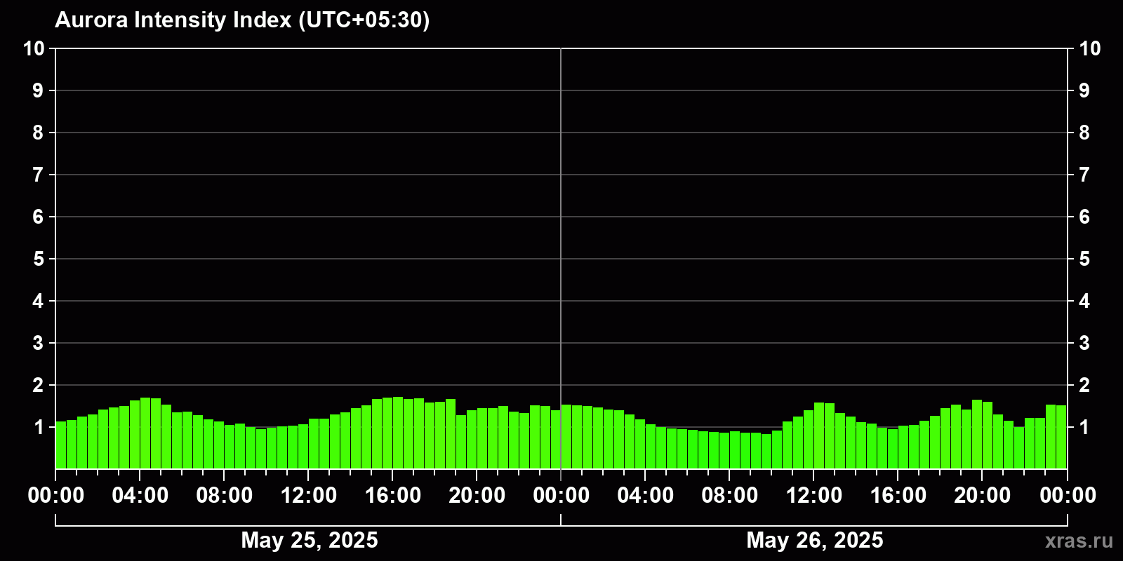 Changes in the auroral intensity index from 2025-05-25 to 2025-05-26 local time