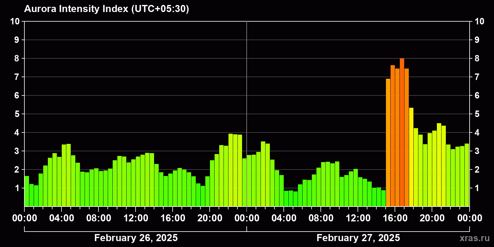 Auroral intensity index and the theoretically possible latitude of observations for nighttime in the Estern Hemisphere as of 2025-02-27 23:51 (end of day) local time