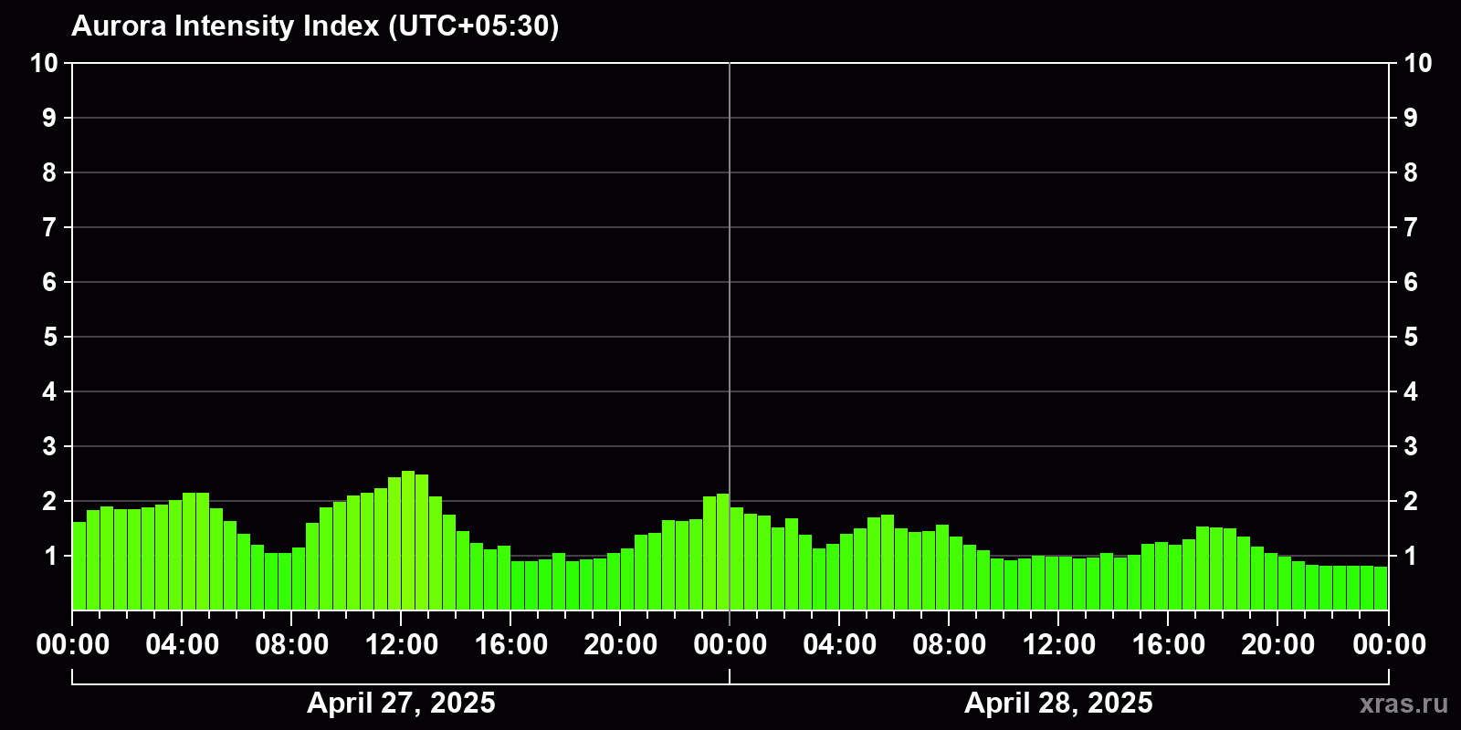 Auroral intensity index and the theoretically possible latitude of observations for nighttime in the Estern Hemisphere as of 2025-04-28 23:57 (end of day) local time