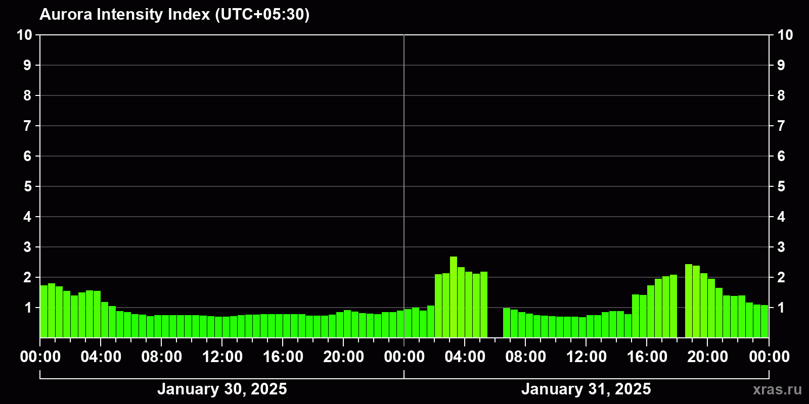 Changes in the auroral intensity index from 2025-01-30 to 2025-01-31 local time