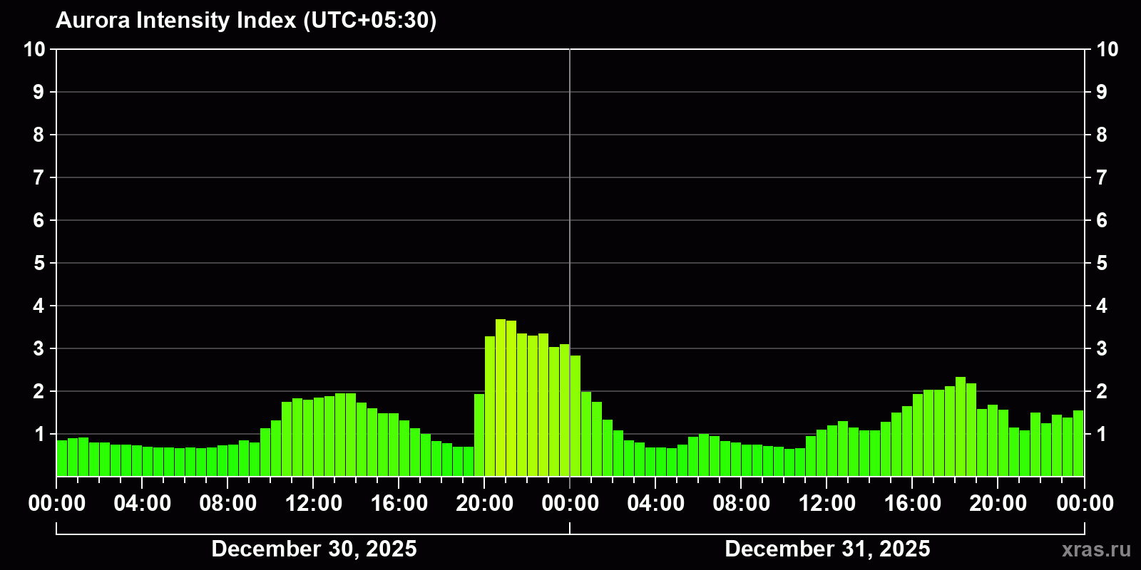 Changes in the auroral intensity index from 2025-12-30 to 2025-12-31 local time