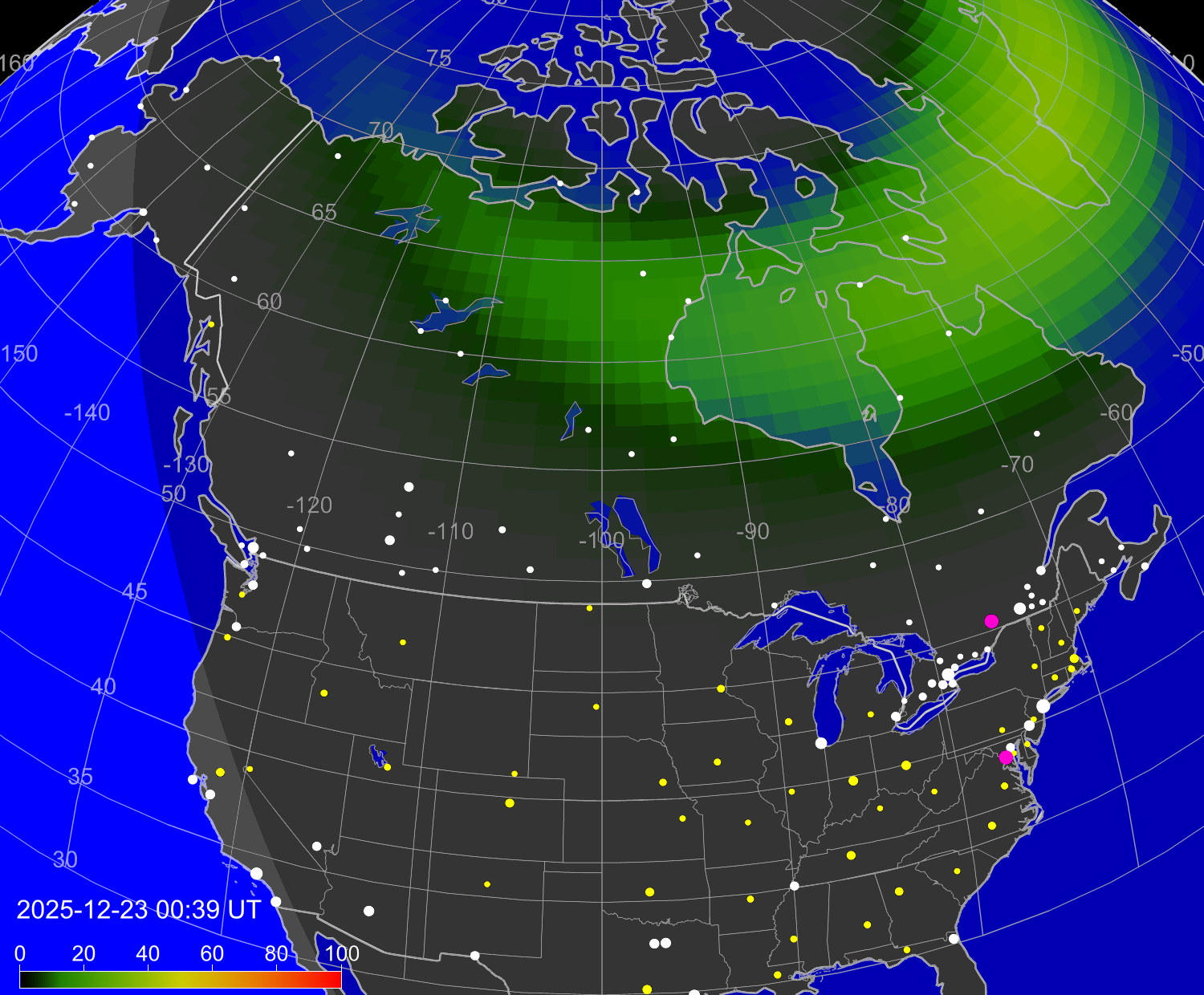 Вероятность полярных сияний в городах Канады