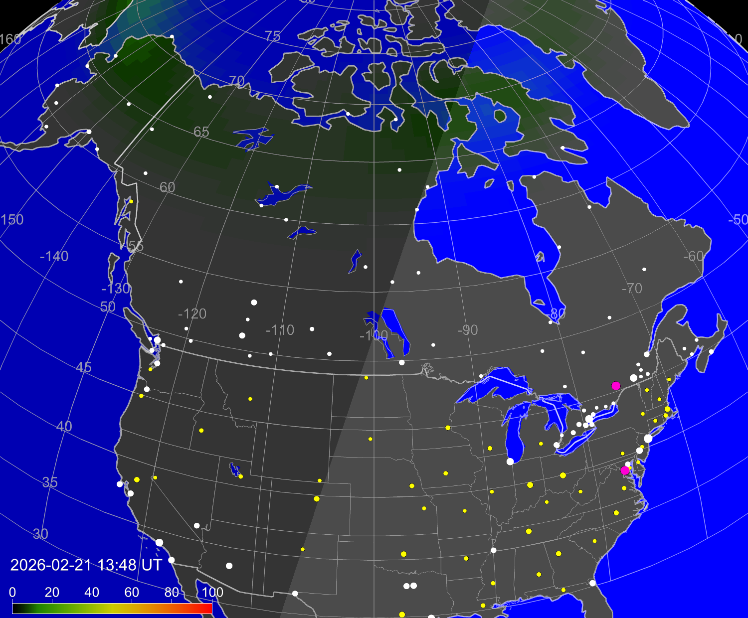 Индекс интенсивности полярных сияний и теоретически возможная широта наблюдений для ночного времени в западном полушарии