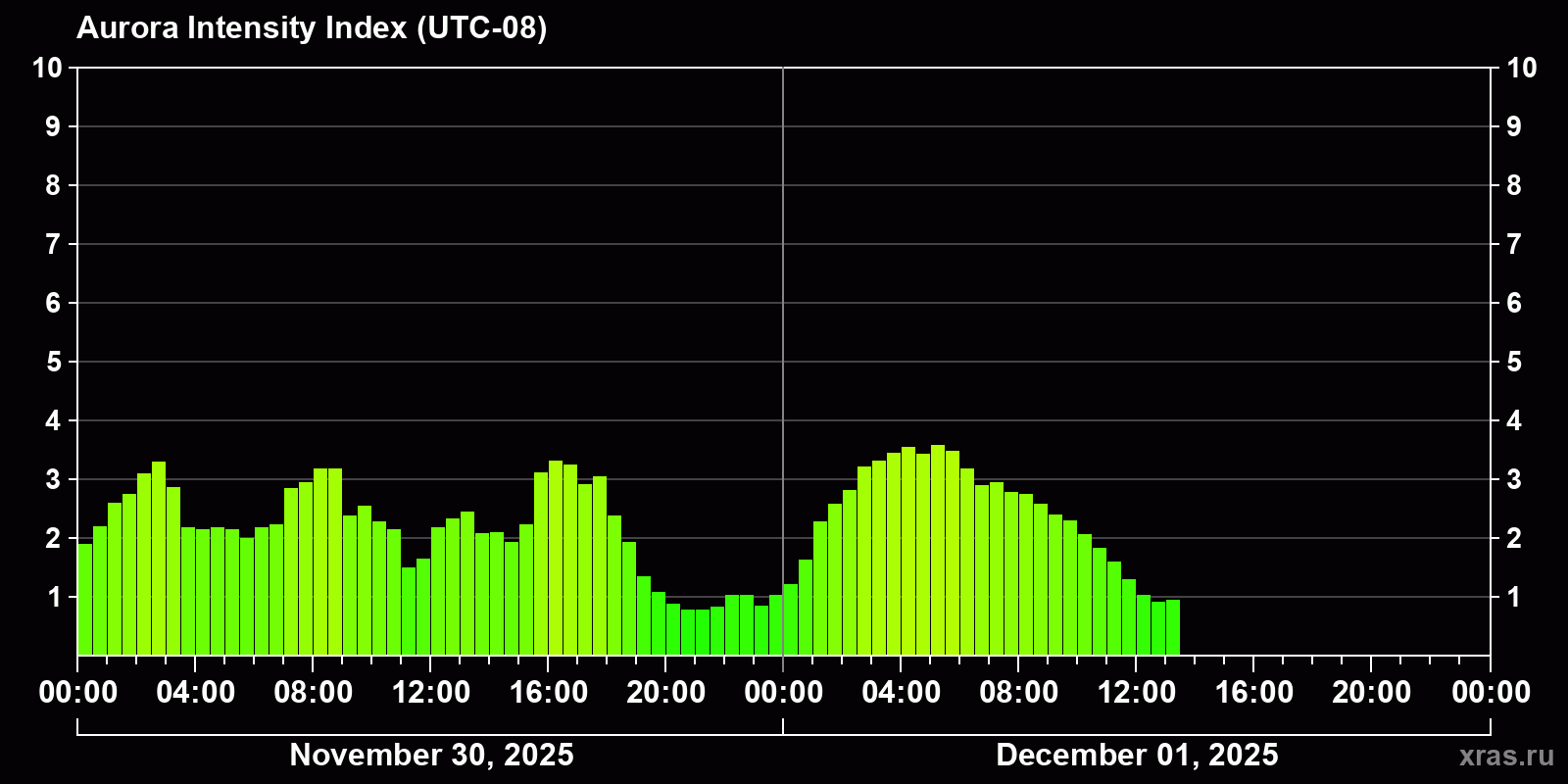 Auroral intensity index and the theoretically possible latitude of observations for nighttime in the Western Hemisphere as of 2025-12-01 06:20 (end of day) local time