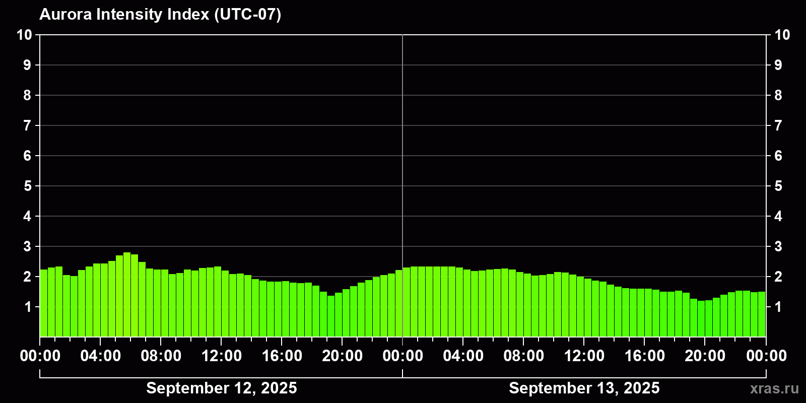 Auroral intensity index and the theoretically possible latitude of observations for nighttime in the Western Hemisphere as of 2025-09-13 23:49 (end of day) local time