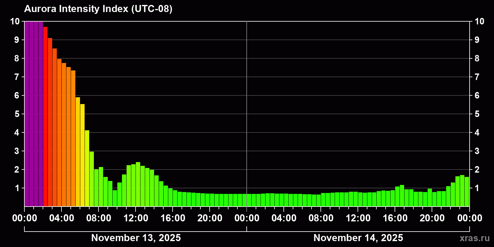 Changes in the auroral intensity index from 2025-11-13 to 2025-11-14 local time