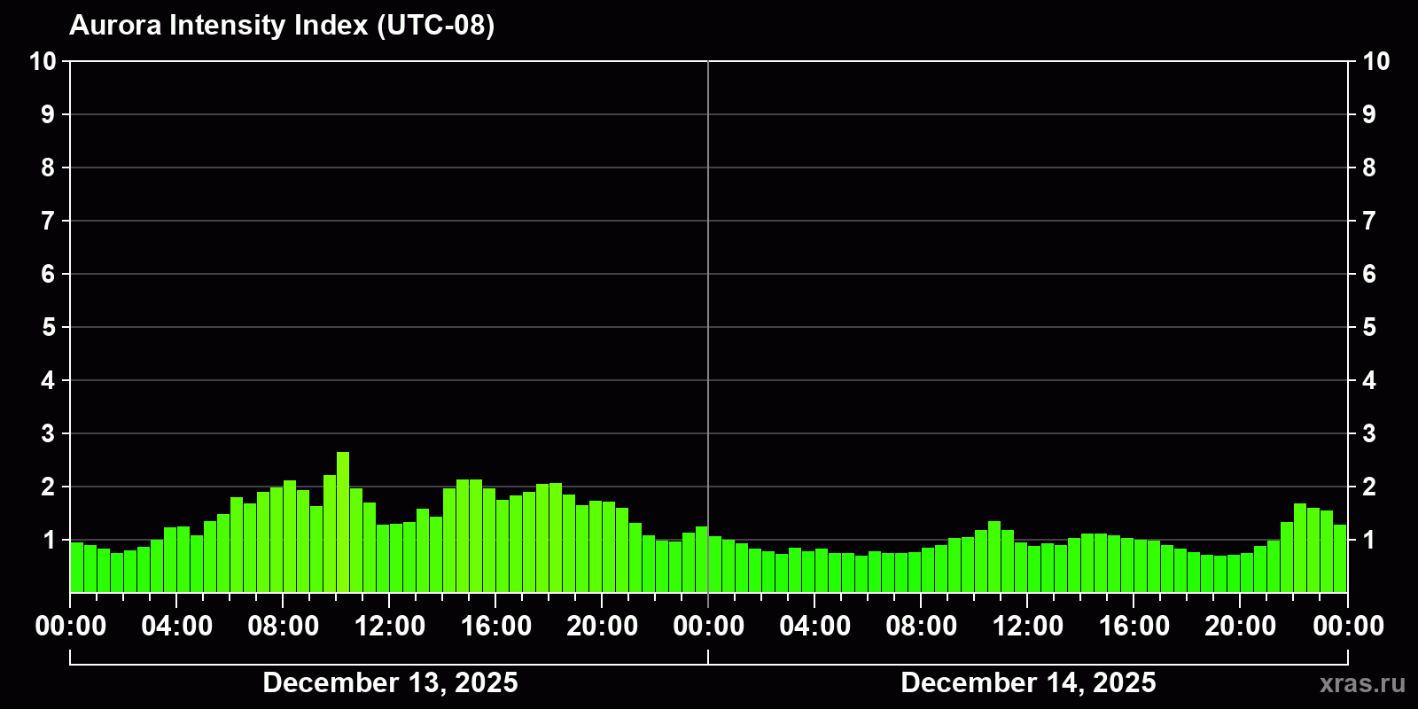 Changes in the auroral intensity index from 2025-12-13 to 2025-12-14 local time