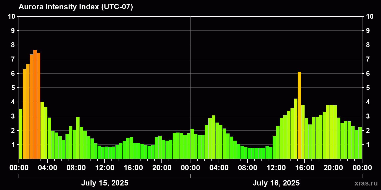 Changes in the auroral intensity index from 2025-07-15 to 2025-07-16 local time