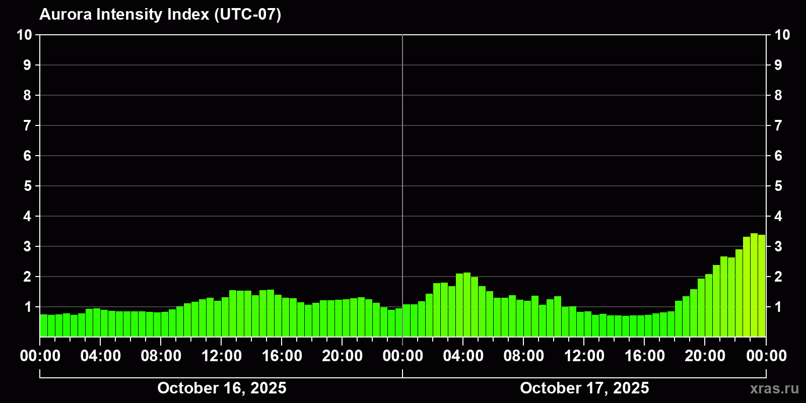 Auroral intensity index and the theoretically possible latitude of observations for nighttime in the Western Hemisphere as of 2025-10-17 23:49 (end of day) local time