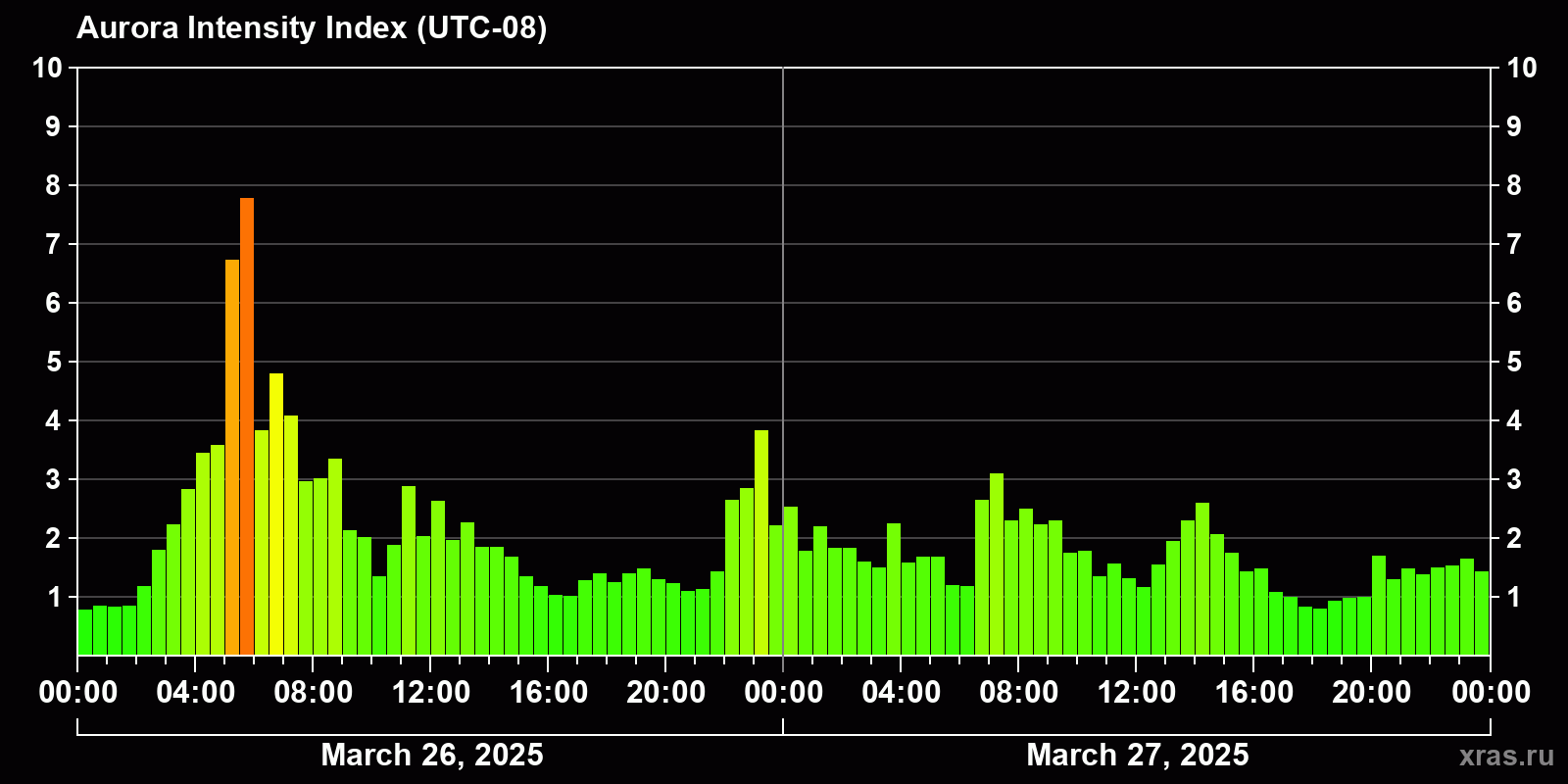 Changes in the auroral intensity index from 2025-03-26 to 2025-03-27 local time