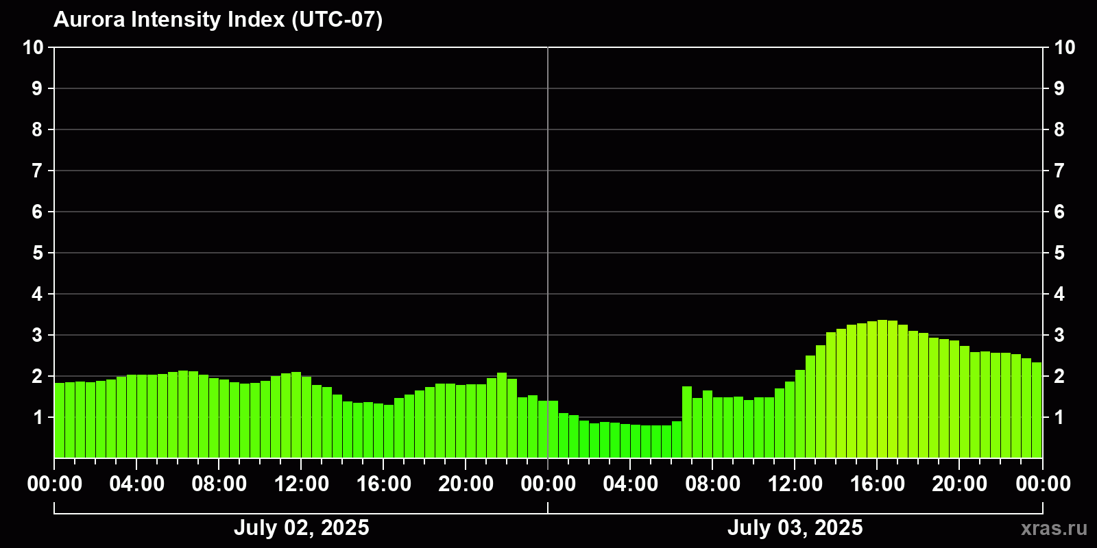 Changes in the auroral intensity index from 2025-07-02 to 2025-07-03 local time