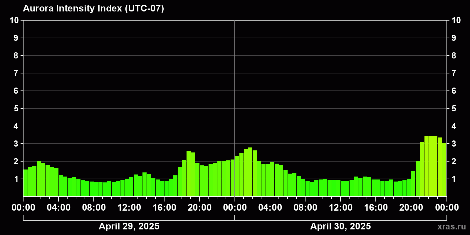 Auroral intensity index and the theoretically possible latitude of observations for nighttime in the Western Hemisphere as of 2025-04-30 23:53 (end of day) local time