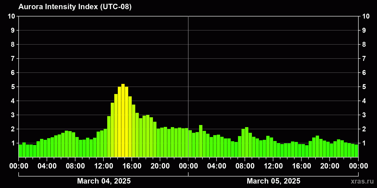 Changes in the auroral intensity index from 2025-03-04 to 2025-03-05 local time