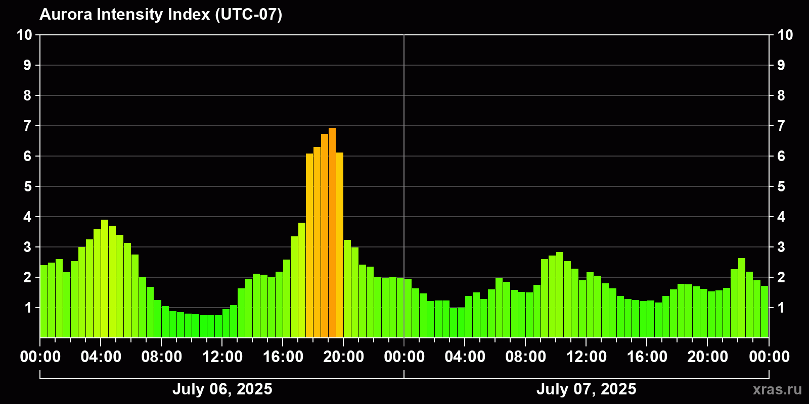 Changes in the auroral intensity index from 2025-07-06 to 2025-07-07 local time