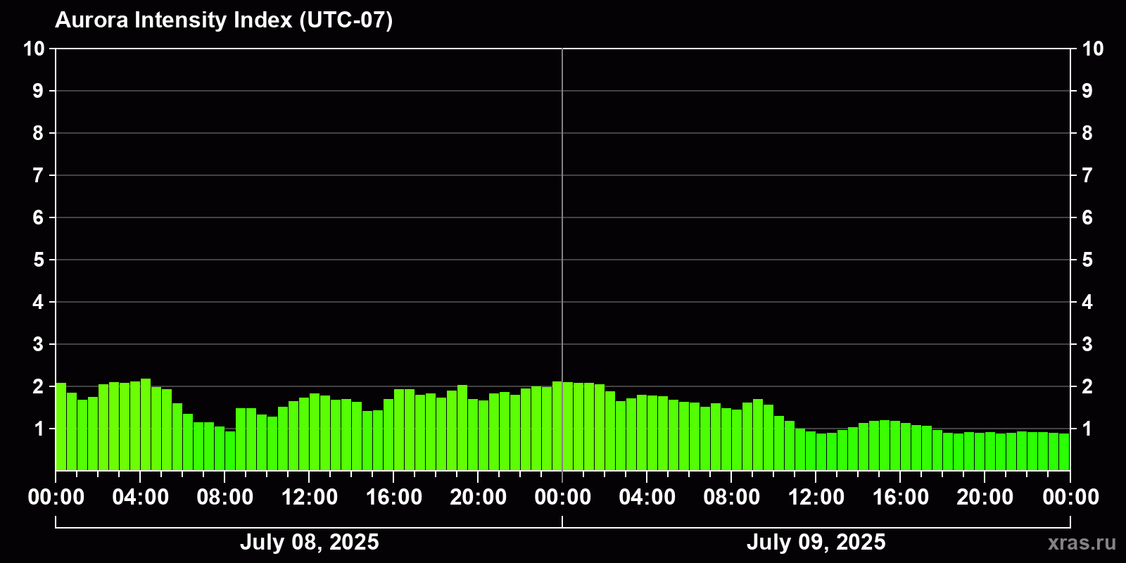 Changes in the auroral intensity index from 2025-07-08 to 2025-07-09 local time
