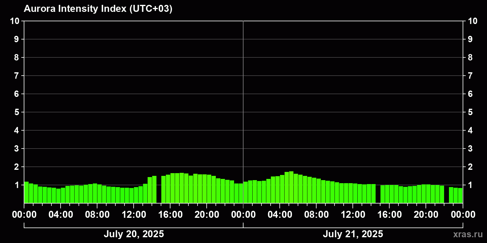 Auroral intensity index and the theoretically possible latitude of observations for nighttime in the Estern Hemisphere as of 2025-07-21 23:50 (end of day) local time