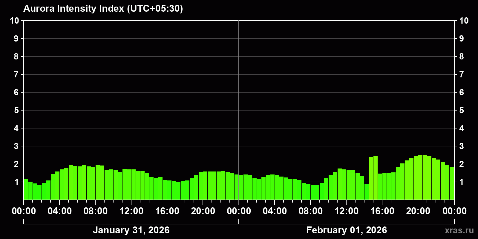 Auroral intensity index and the theoretically possible latitude of observations for nighttime in the Estern Hemisphere as of 2026-02-01 23:48 (end of day) local time